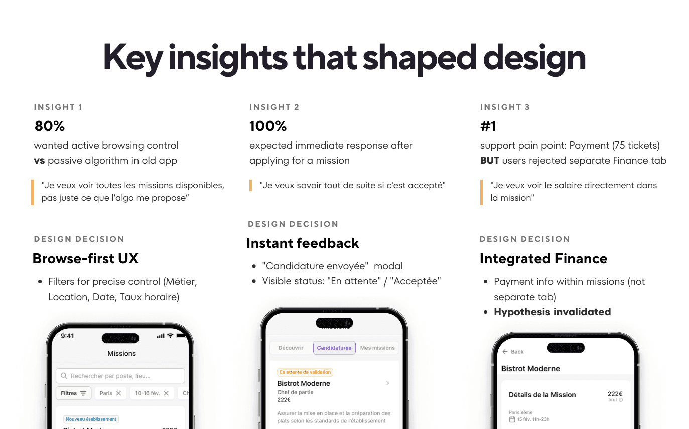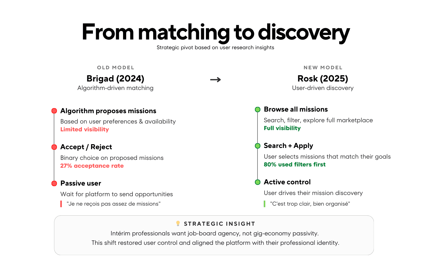Based on Rosk's manifesto and Brigad's learnings, I developed 7 testable hypotheses. The key questions: How do intérim professionals want to discover work differently from freelancers? Should the 3-pillar vision translate directly to navigation? How do we integrate financial transparency—our biggest customer support pain point?