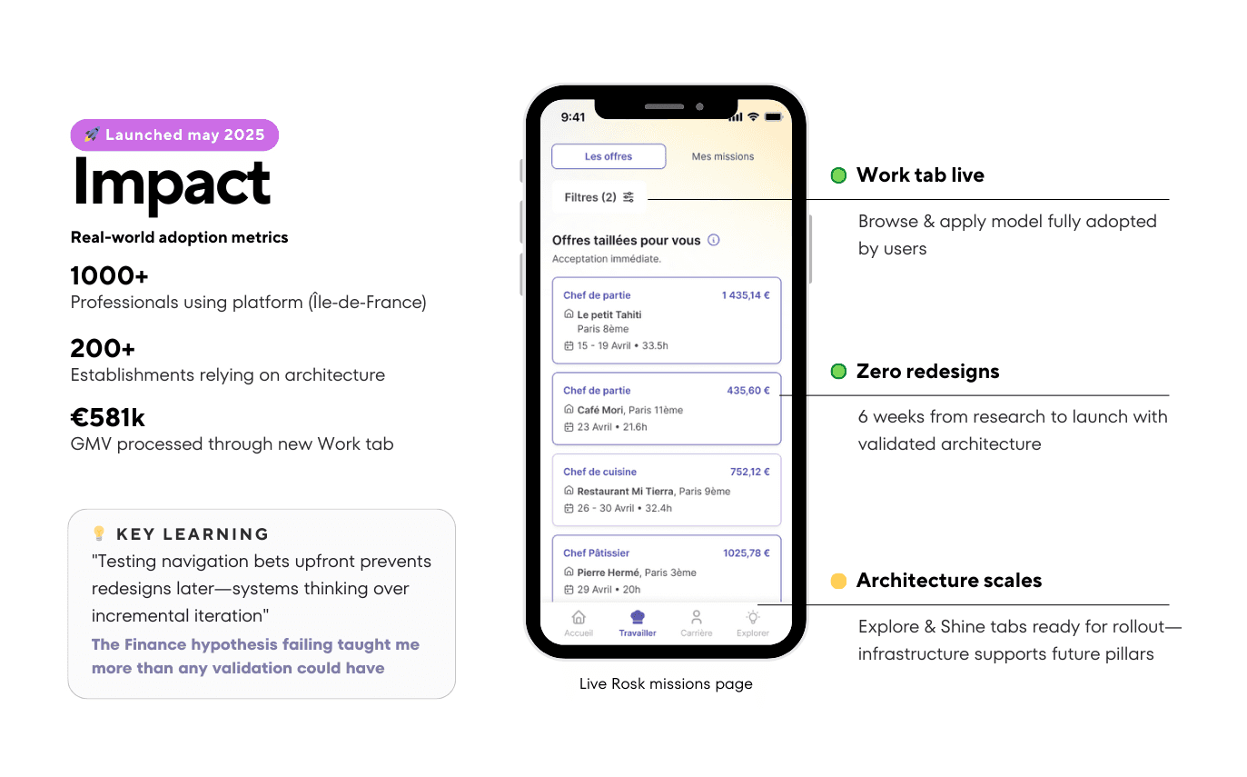 Research wins that mattered: The Finance hypothesis being wrong? That saved the team months of building a section nobody wanted. The direct discovery insight became the entire UX philosophy for the Work pillar. And those community features everyone was uncertain about? Users lit up talking about them — validating Rosk's differentiator.