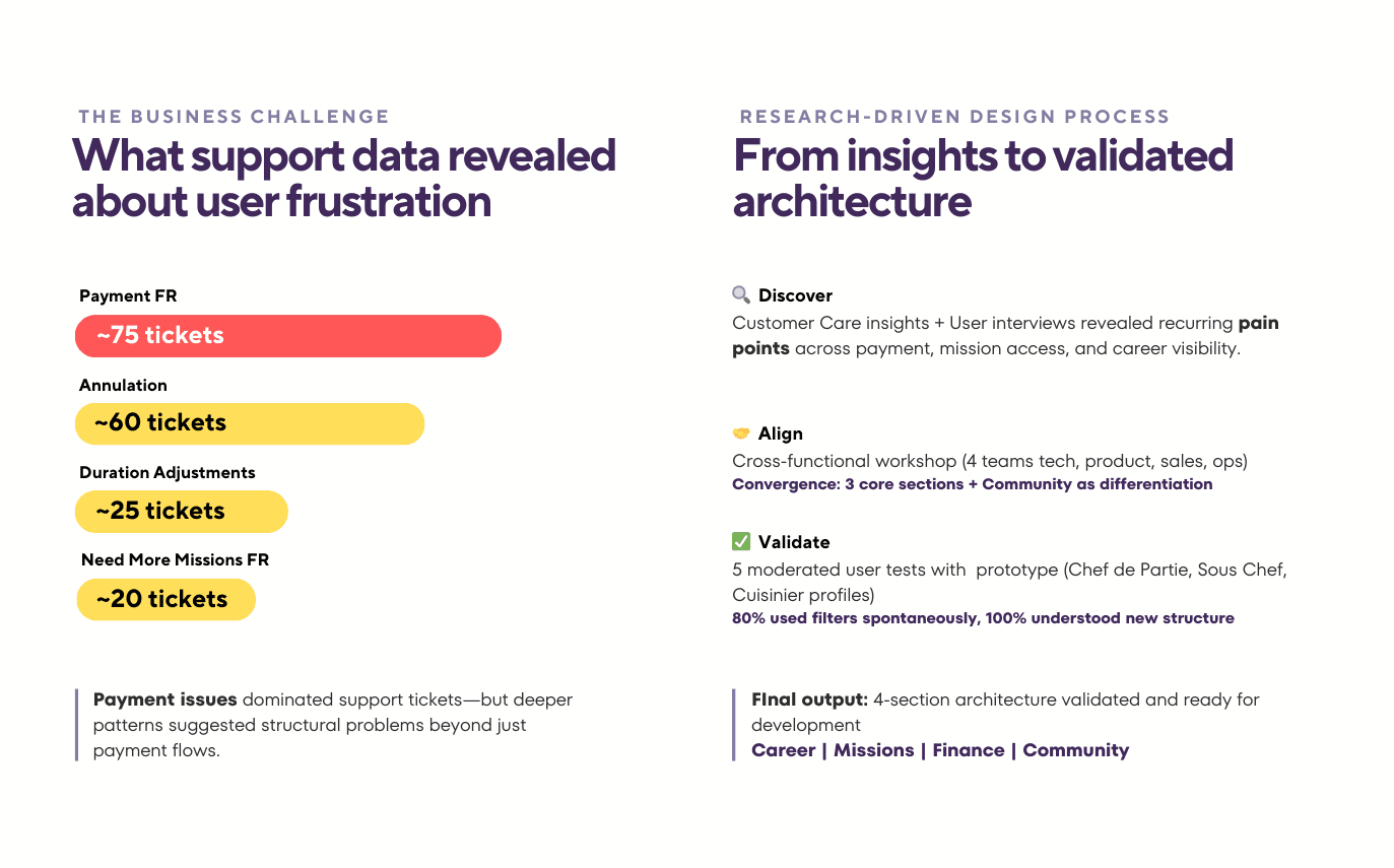 Finance hypothesis invalidated: Despite payment being our #1 customer support issue, users wanted financial info integrated within missions, not as a separate section. This insight shaped our architecture proposal.